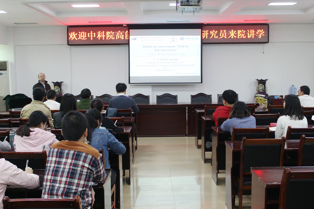 4月25日下午,应学院邀请,中国科学院高能物理研究所赵强研究员来我院讲学,在理科楼五楼连廊会议室作了题为“强子奇特态前沿物理介绍”的学术报告。我院近百名师生聆听了报告,报告会由院长助理龚克主持。