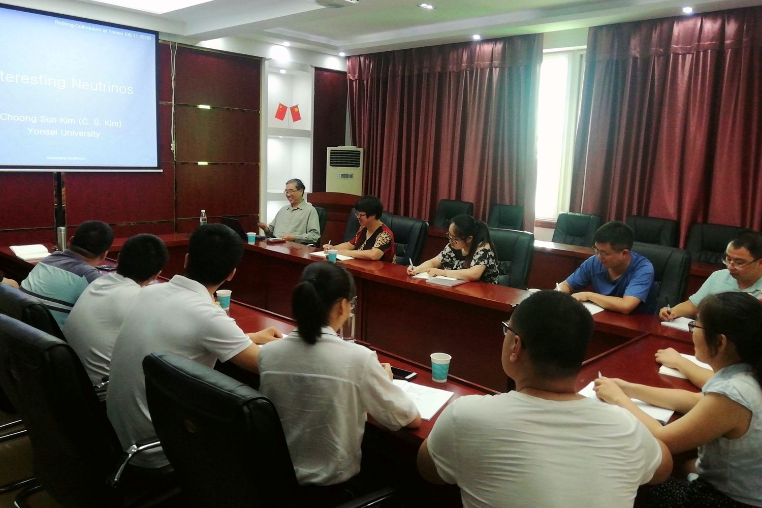 7月11号上午,Choong Sun Kim教授在理科楼南楼501会议室作了题为“Interesting neutrino physics”的学术报告,报告会由理论物理研究所所长王茹敏教授主持,我校部分教师和研究生聆听了报告。Kim教授从中微子的产生讲起,详细介绍了中微子的特征、振荡、实验观测手段和理论现状,并对中微子物理的未来研究做出展望。报告会期间,多次就现场师生感兴趣的问题进行交流讨论。