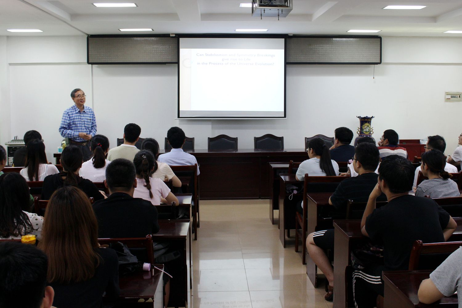 7月10日上午,Kim教授在理科楼五楼连廊502学术报告厅作了题为“Biogenesis within Evolution of Universe”的学术报告,报告会由金沙集团1862cc成色物理系主任刘墨林教授主持,我校部分教师、在校研究生、本科生等80余人聆听了报告。Kim首先从宇宙大爆炸讲起,讲述了宇宙的早期微观结构和今天的形成过程。随后阐述了从什么是生命,并分析了在宇宙演化过程生命出现的条件和进化过程。最后探讨了宇宙形成与生命进化过程中的相关和相似因素。报告会结束后,Choong Sun Kim教授与现场师生进行了进一步地交流讨论,热情的回答了师生的提问。