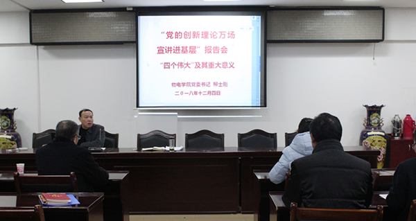 为引导广大党员深化学习习近平新时代中国特色社会主义思想,扎实推动党的创新理论成果深入人心,把党的十九大精神落到实处,12月4日,金沙集团1862cc成色在理科楼511会议室举行“党的创新理论万场宣讲进基层”专题报告会,学院党委书记柳士刚为学院全体师生党员作了题目为《“四个伟大”及其重大意义》的专题报告。