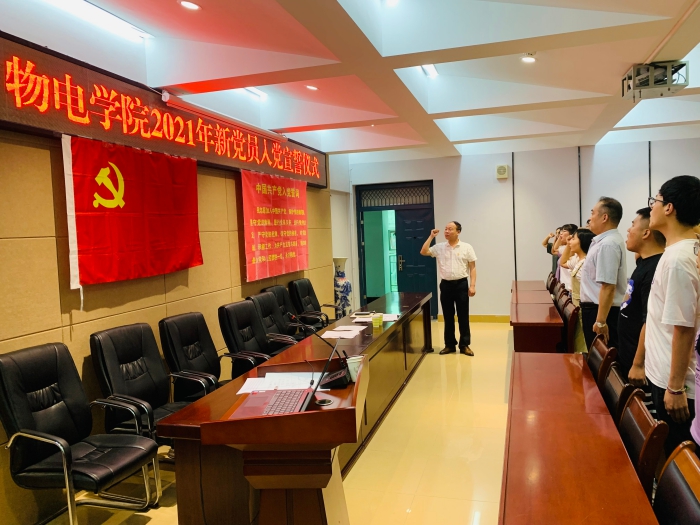 根据学校《关于在“七一”前夕广泛组织开展新党员入党宣誓和党员重温入党誓词活动的通知》要求,6月17日,学院2021年上半年新党员在理科楼四楼会议室举行入党宣誓仪式,学院党委书记柳士刚、副书记李刚和53名新党员参加了仪式,仪式由李刚主持。
