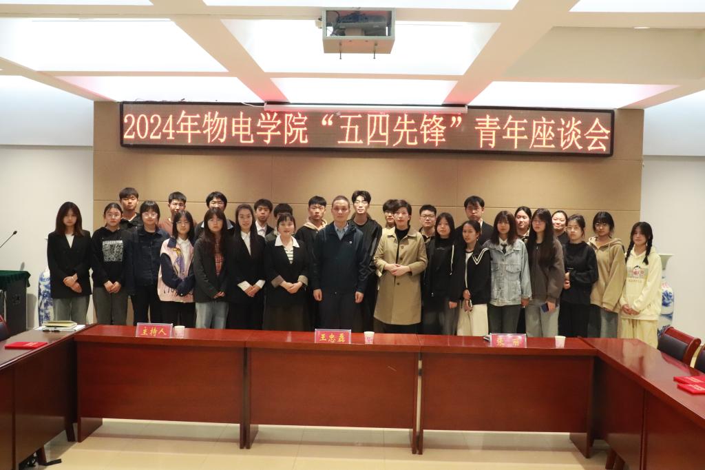 为深入学习贯彻习近平新时代中国特色社会主义思想,弘扬“五四”精神,表彰先进典型,发挥榜样作用。4月30日,我院于理科楼连廊402召开“五四先锋”青年座谈会。学校党委学生工作部副部长、学生处副处长王忠磊,学院党委副书记张丽,团委老师牛文娟莅临现场,学生代表参加会议。