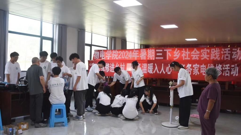 为引导青年大学生在服务基层群众中拓展眼界、提升素质,在社会课堂中受教育、长才干、作贡献。7月5日,我院“物小电”义务维修队深入潢川县万营村开展“家电维修进乡村,服务温暖入人心”社会实践活动。我院指导教师余大庆、团委老师牛文娟全程参加。
